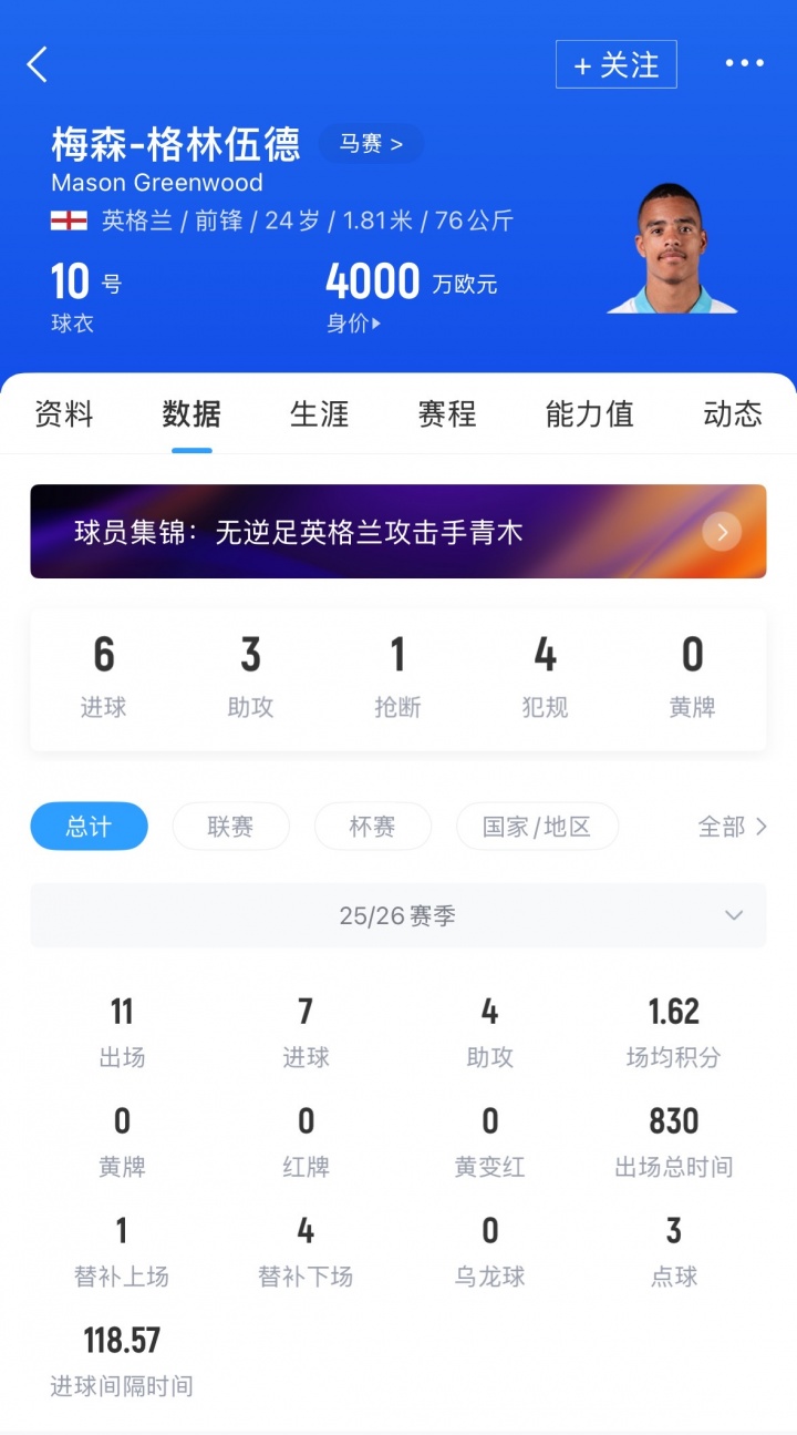10月24日讯 格林伍德本赛季继续保持出色发挥,据知名记者罗马诺消息,曼联有球员50%的二转分成,这意味着球队可能在未来从中获得一大笔资金。