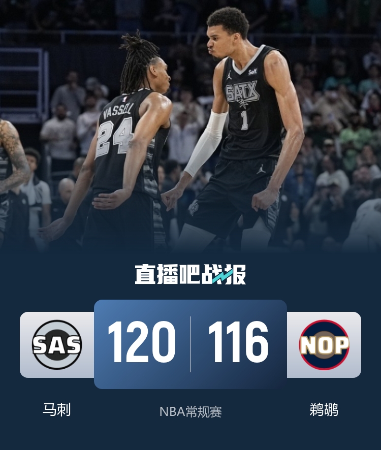 比赛开始,锡安和文班亚马各自暴扣开局,随后文班亚马连续大帽锡安,双方各种暴扣打得难解难分,普尔连续三分,首节马刺领先3分,次节文班各种单打异常精彩,但鹈鹕全民皆兵能回应咬住比分,最后2分钟鹈鹕10-2小高潮半场反超1分。下半场,文班继续内线各种取分,双方外线又展开对飚,瓦塞尔连续3记三分助马刺建立主动权,但鹈鹕连续攻击内线追到差2分,末节锡安贡献炸裂补扣,墨菲和霍金斯连续三分领先到6分,但文班下场后哈珀和巴恩斯回应三分,马刺轰出14-0攻击波再反超回来,关键时刻鹈鹕10-2又反超2分,卡斯尔关键三分,锡安两罚中一,文班中投绝杀未中,进入加时。加时赛,文班暴扣加大帽后6犯毕业,但卡斯尔带队领先到8分,锡安再失误后卡斯尔也失误,巴恩斯两罚全中杀死比赛,最终马刺加时120-116险胜鹈鹕,拿到2连胜。
